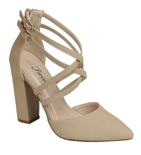Sonia-65 combines architectural heel design with refined details for polished everyday wear. The pointed-toe silhouette and block heel deliver confident height without compromise, while the cross strap and buckle closure ensure a secure, adjustable fit. Zipper back entry simplifies dressing, and the fully enclosed construction—closed toe, back, and sides—provides structure and support. A versatile choice for professional and social occasions.